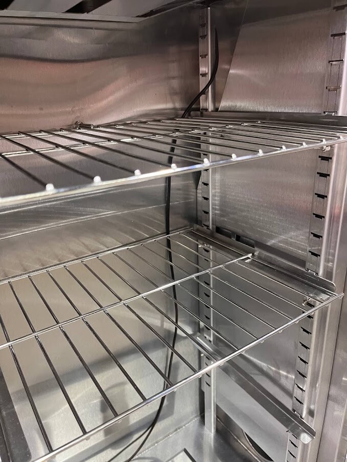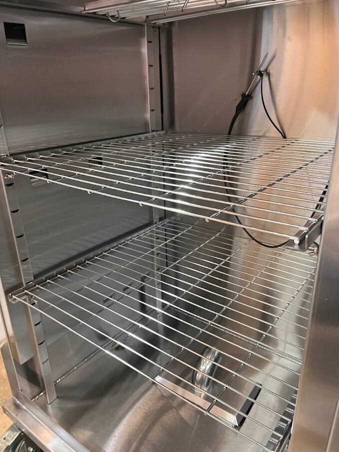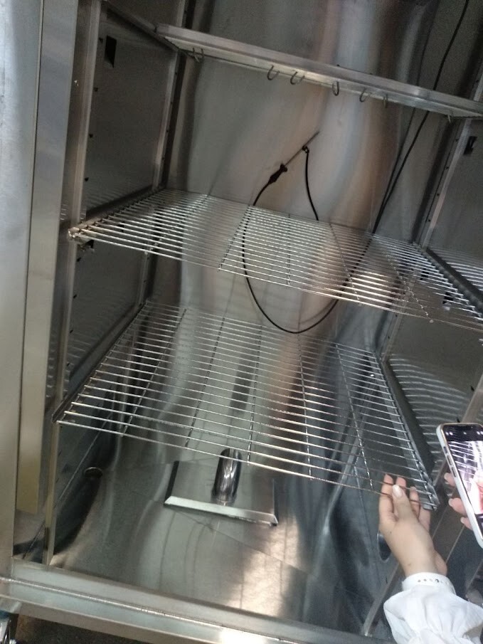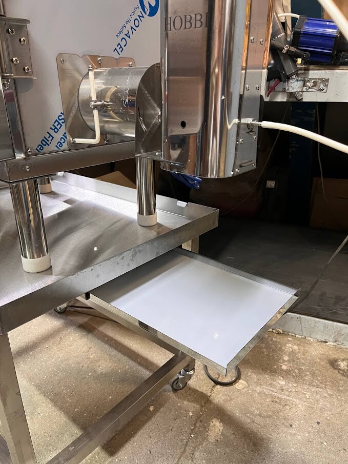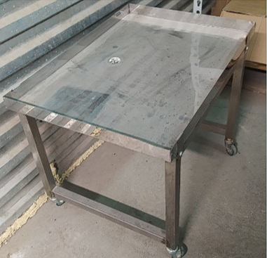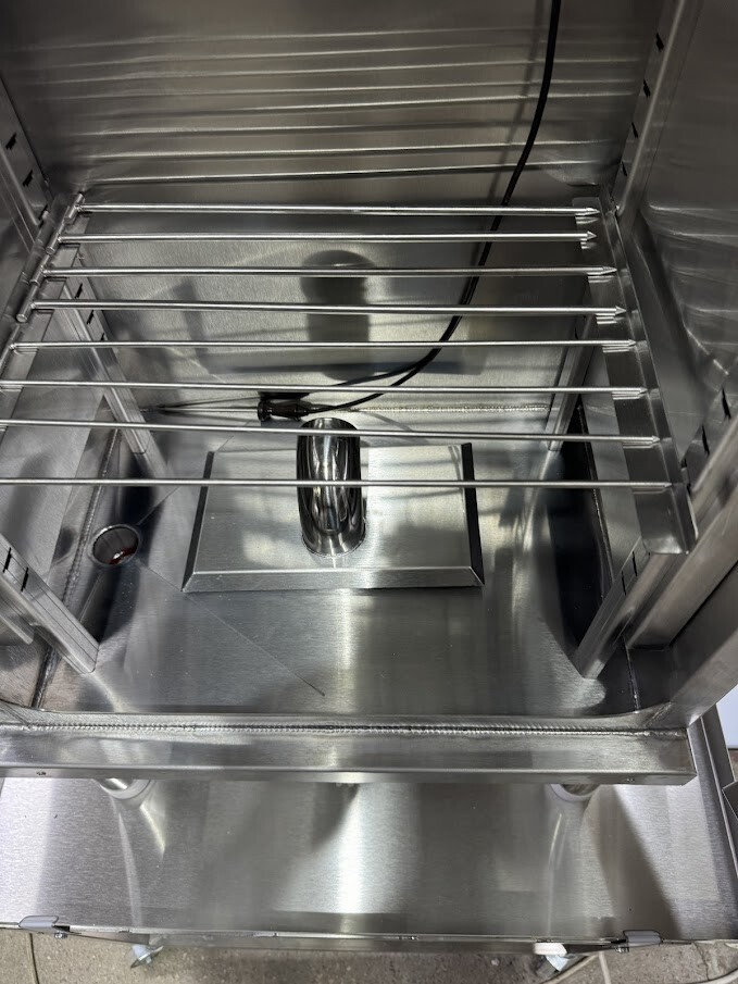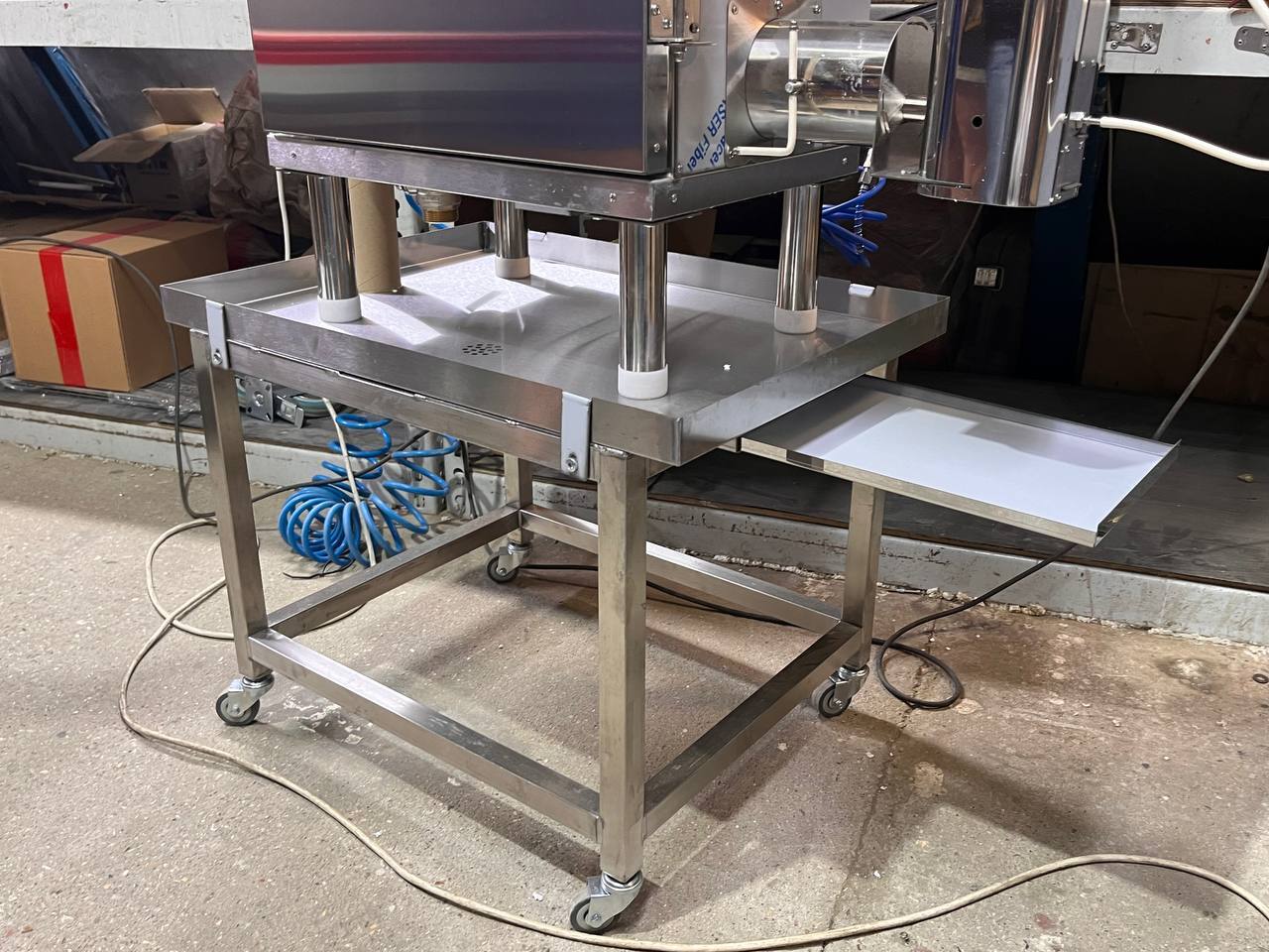 Подстолье из пищевой нержавеющей стали, оборудовано лотком для сброса щепы из дымогенератора и сливным патрубком для удобства мойки. Было разработано для удобной работы с термокамерой. Высота подстолья подобрана с учетом роста среднего человека, чтобы не приходилось нагибаться при работе.