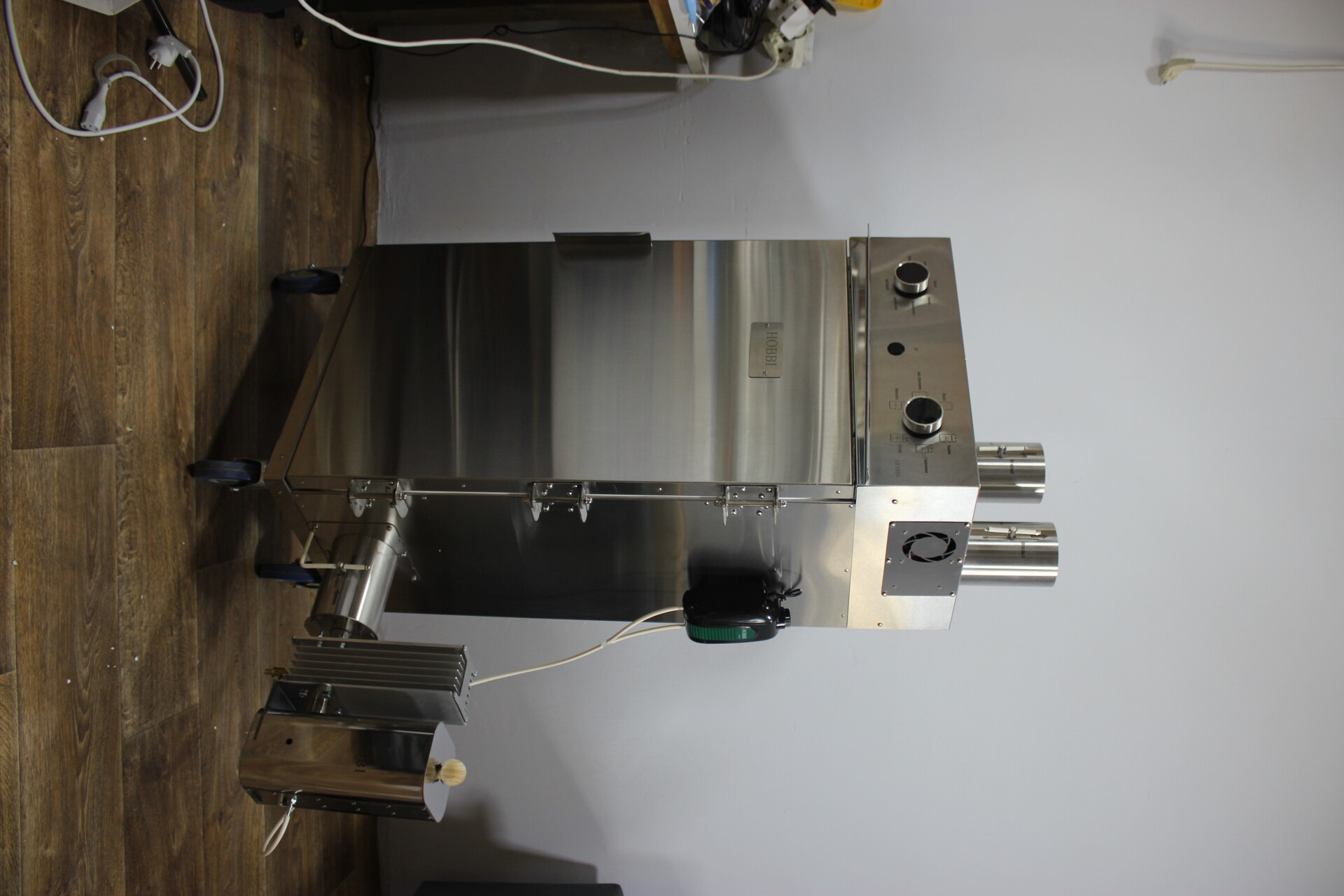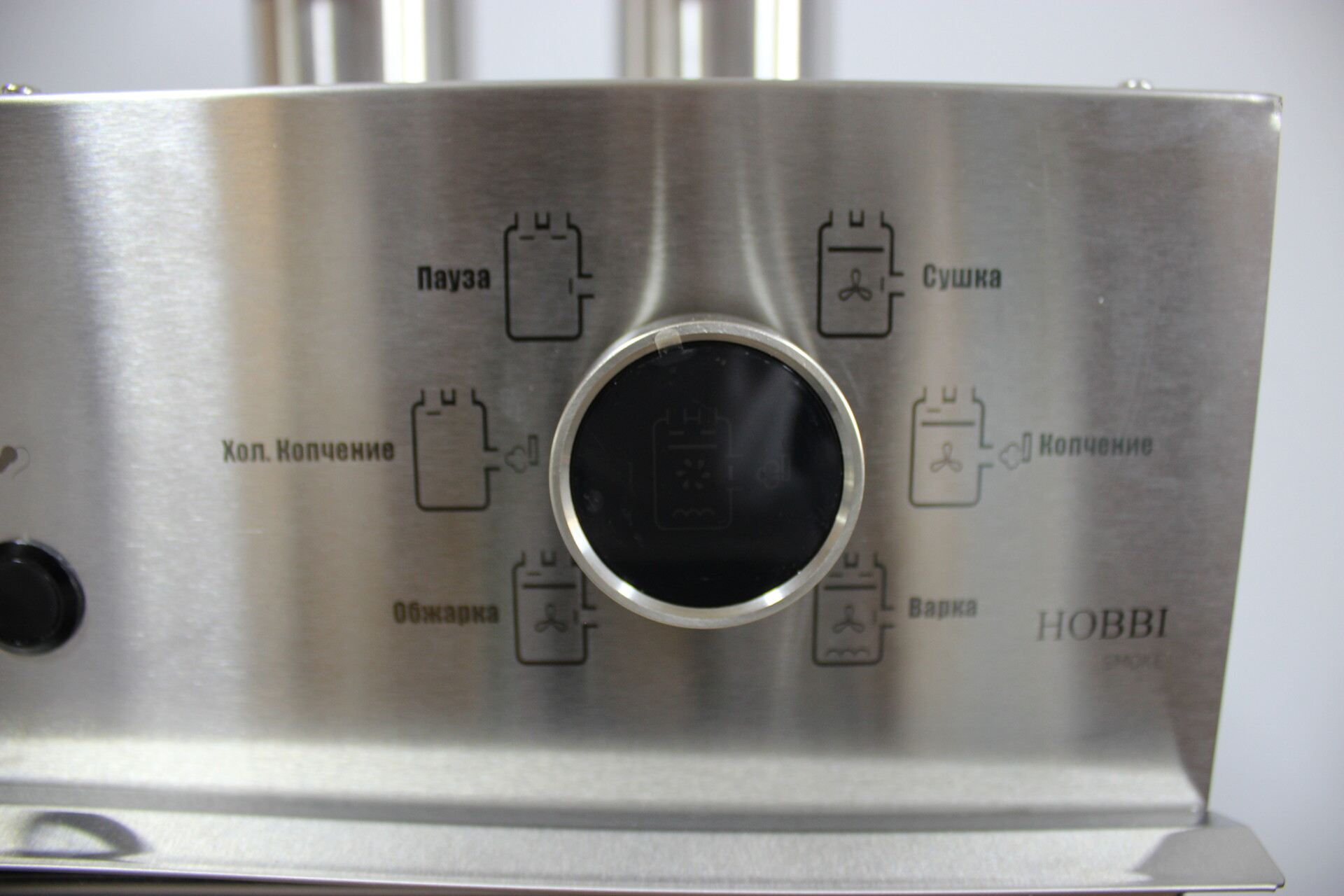Подача дыма происходит при помощи дымогенератора Hobbi Smoke. Включается через приборную панель. Дым на выходе равен заданной температуре в камере.